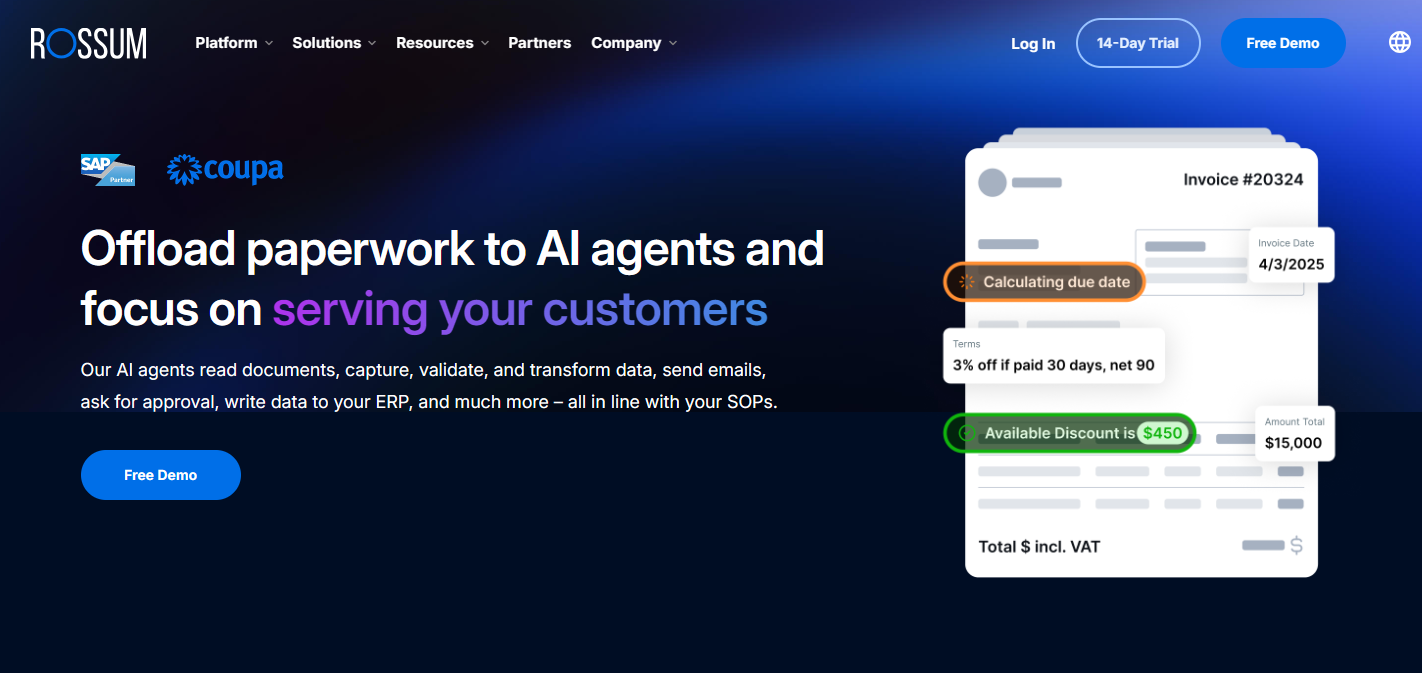 Rossum is built for teams that deal with a high volume of invoices. Instead of relying on basic OCR, it uses AI to understand the layout and meaning of each document, which helps pull out data more accurately. It’s a strong pick for larger organizations that want a smarter, more automated way to handle their invoice load.