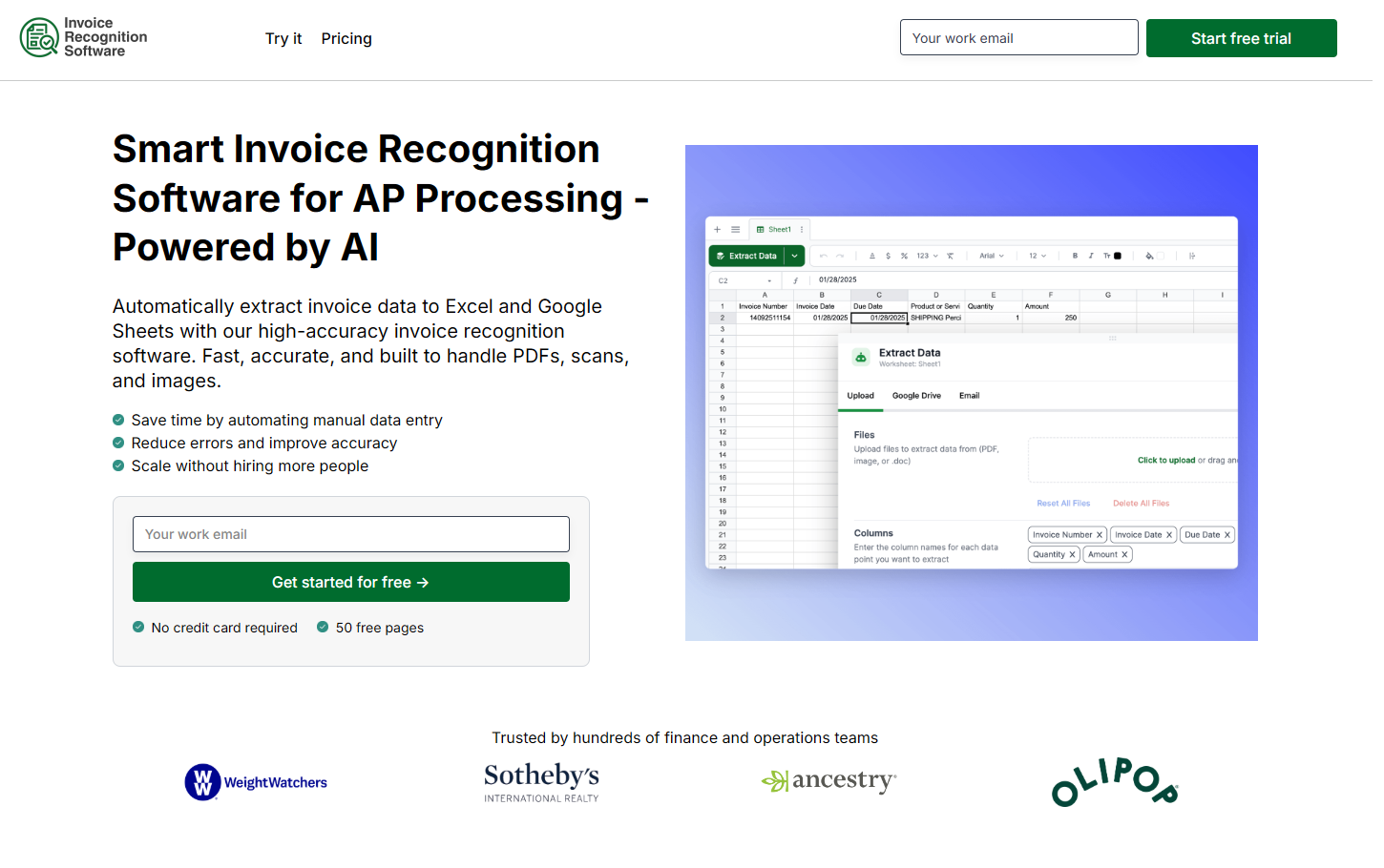 InvoiceRecognitionSoftware.com focuses on highly accurate OCR and easy exports. It’s built for teams that mainly want dependable invoice data capture without the extra complexity of full AP automation.