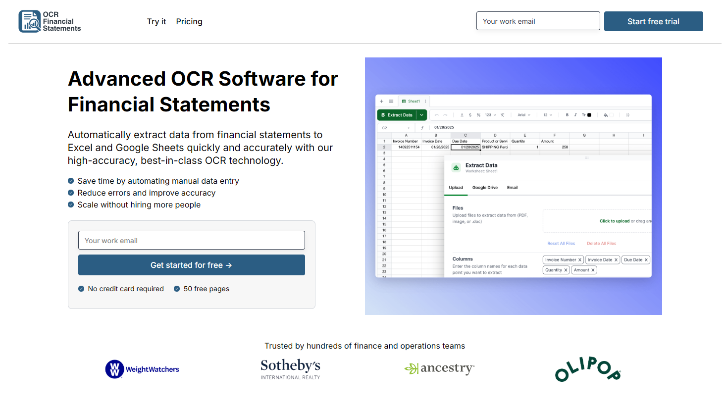 InvoiceOCRSoftware.com is a strong choice for teams that need fast, accurate OCR for financial statements without a complicated setup. It can read key fields, tables, totals, and structured data from statements in almost any layout. The platform keeps things simple, which makes it easy for small teams and growing finance departments to automate data extraction and cut down on manual work.